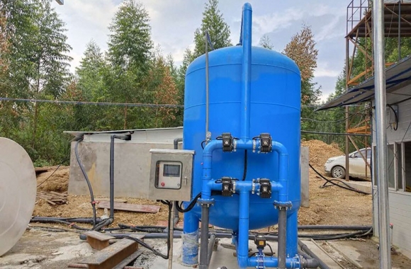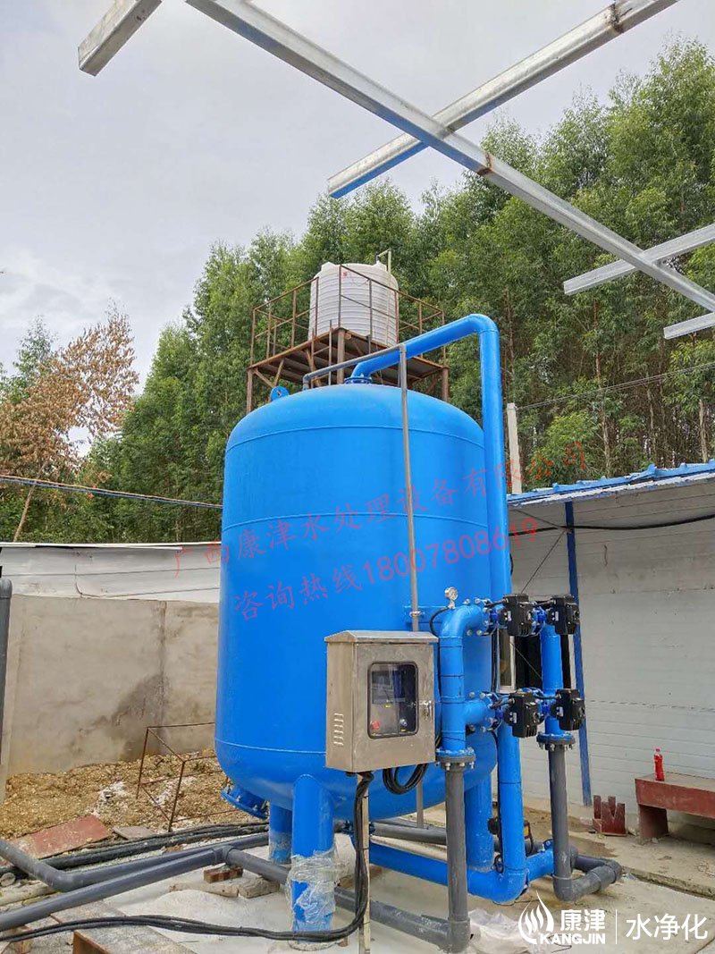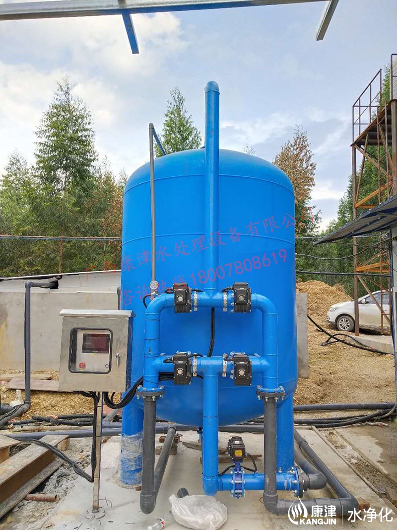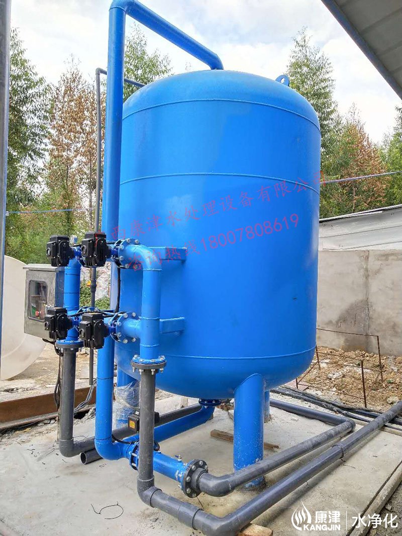 設(shè)備是壓力式的,其原理是當(dāng)原水自上而下通過(guò)濾料時(shí),水中懸浮物由于吸附和機(jī)械阻流作用被濾層表面截留下來(lái);當(dāng)水流進(jìn)濾層中間時(shí),由于濾料層中的砂粒排列的更緊密,使水中微粒有更多的機(jī)會(huì)與砂粒碰撞,于是水中凝絮物、懸浮物和砂粒表面相互粘附,水中雜質(zhì)截留在濾料層中,從而得到澄清的水質(zhì)。經(jīng)過(guò)濾后的出水懸浮物可在3毫克/升以下。