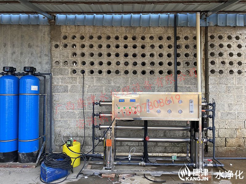 工藝流程:井水-原水箱-石英砂過濾器-活性炭過濾器-精密過濾器-增壓泵-反滲透設備-凈水箱